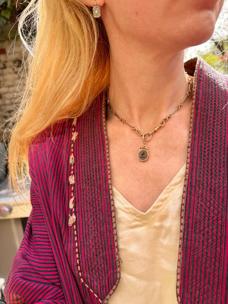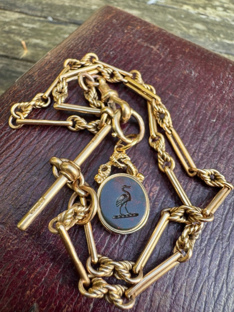 A beautifully made antique fob featuring a standing heron in bloodstone and a monogram in carnelian on the reverse. This was originally a spinner fob, but I have reconfigured it so that the heron sits vertically. Herons are keen fishers, and a standing pose came to represent patience and calm power. The heron is very finely carved, and can be identified by the tiny tuft of feathers on its head.