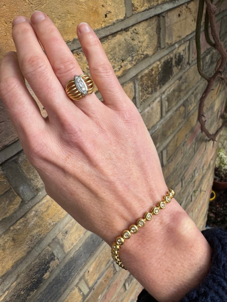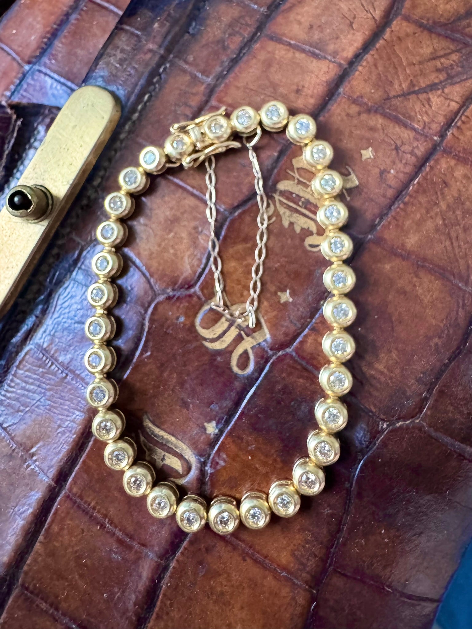 A classic, ultra bright tennis bracelet set in 18ct gold. The thick gold “bubble” setting makes this extra impactful. Loving it solo, but it is chunky enough to stack in with other pieces. The stones are set securely in bezels and the piece closes with a double safety clasp and a safety chain. Truly one meant for everyday wear.