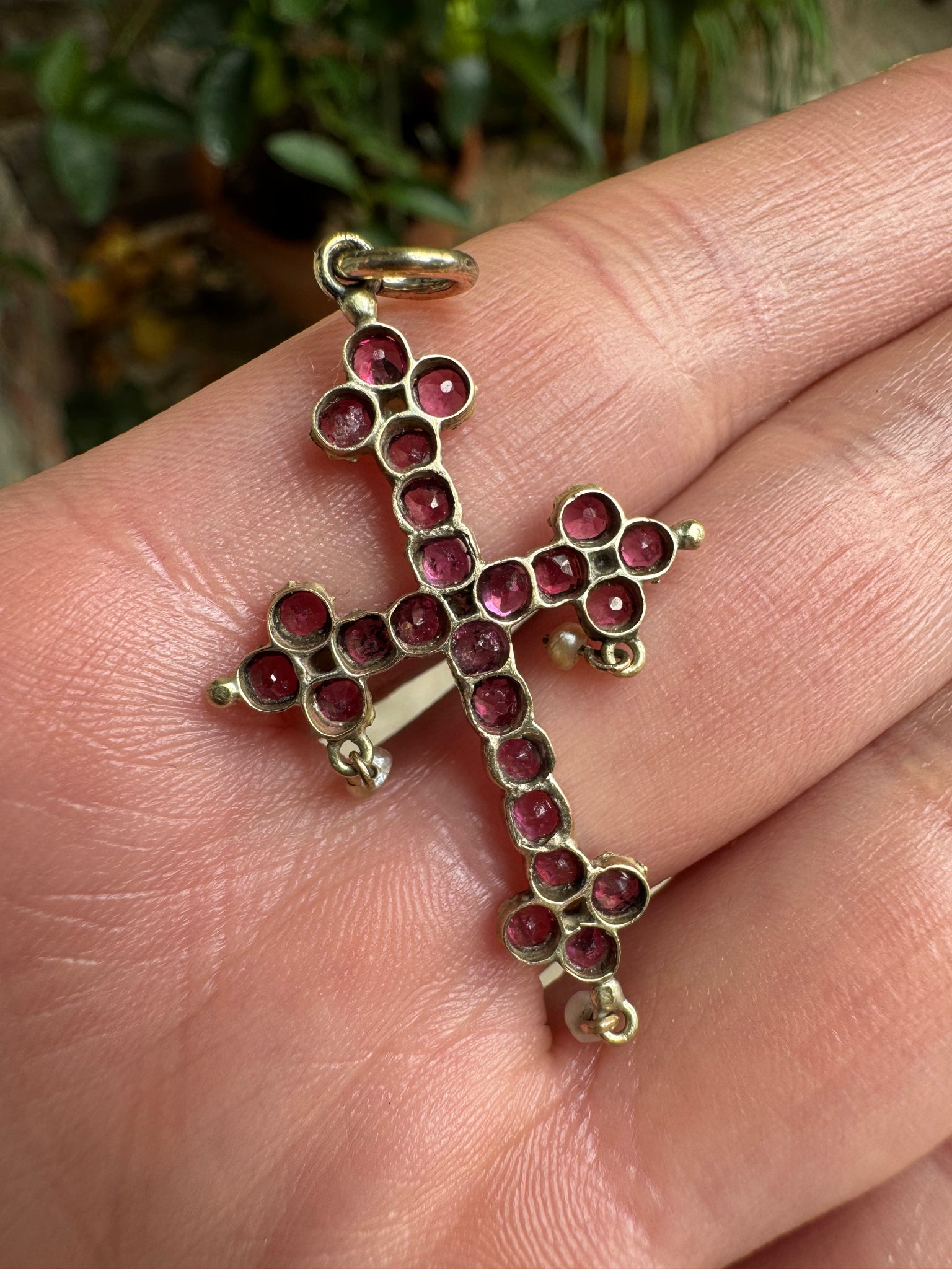 c. 1820 Georgian Gold, Garnet and Pearl Cross Pendant