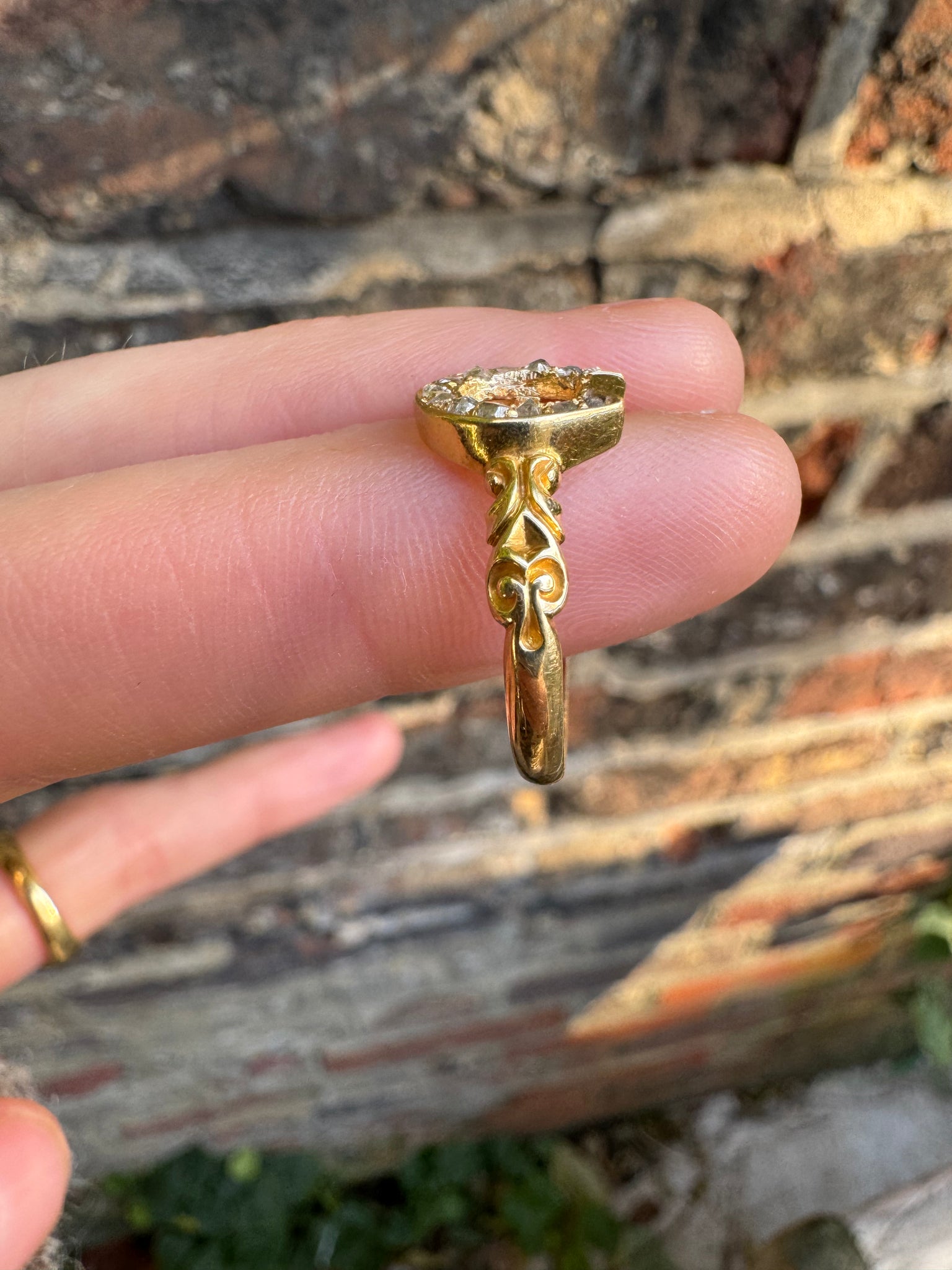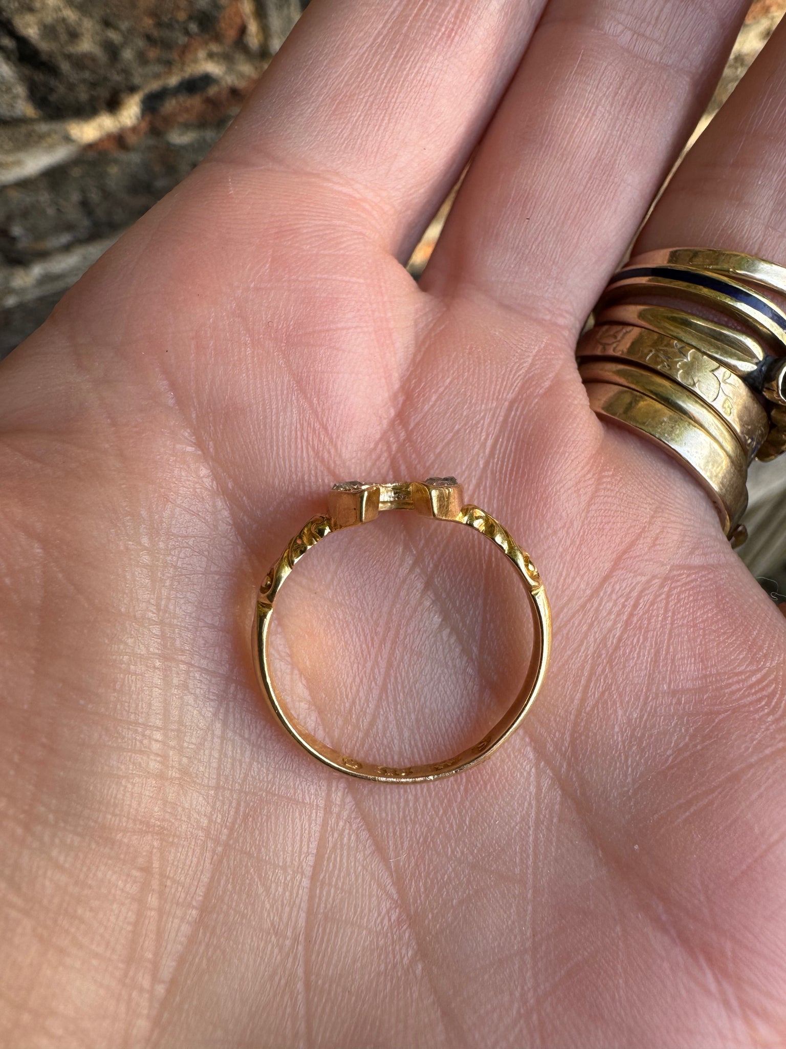 Sharing an ultra sunny 18t gold and diamond horseshoe ring. The horseshoe is set with 13 rose cut diamonds. Love the decorative shoulders and the way the rose cuts in the horseshoe play in the low light.