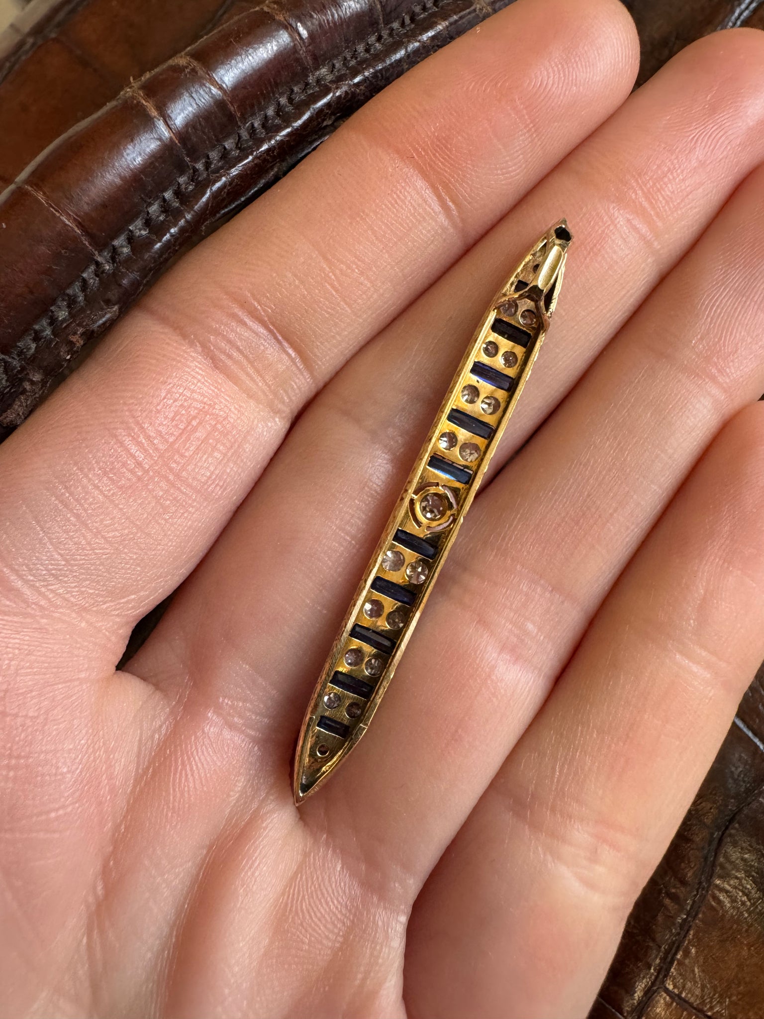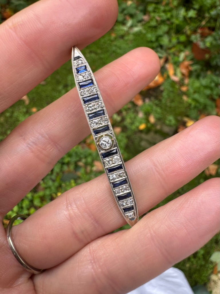 I converted this c. 1920 sapphire and diamond brooch into a pendant and I love the spiky result. I love the overlay of platinum over the 18ct base, and the fine details on the sides of the piece. It is vibrant and stripy and I think the vertical orientation makes it quite modern. One of my favourite conversions to date!