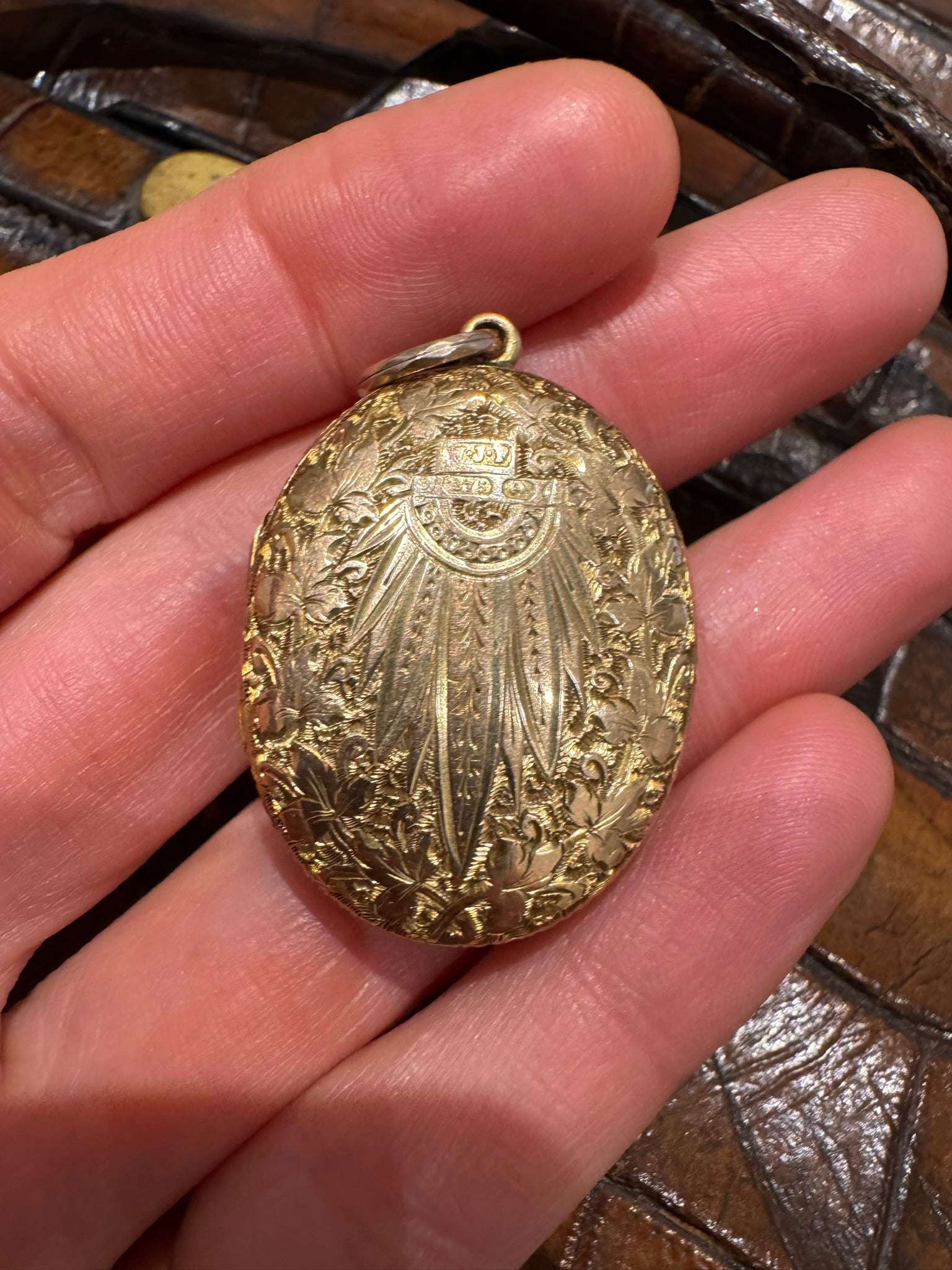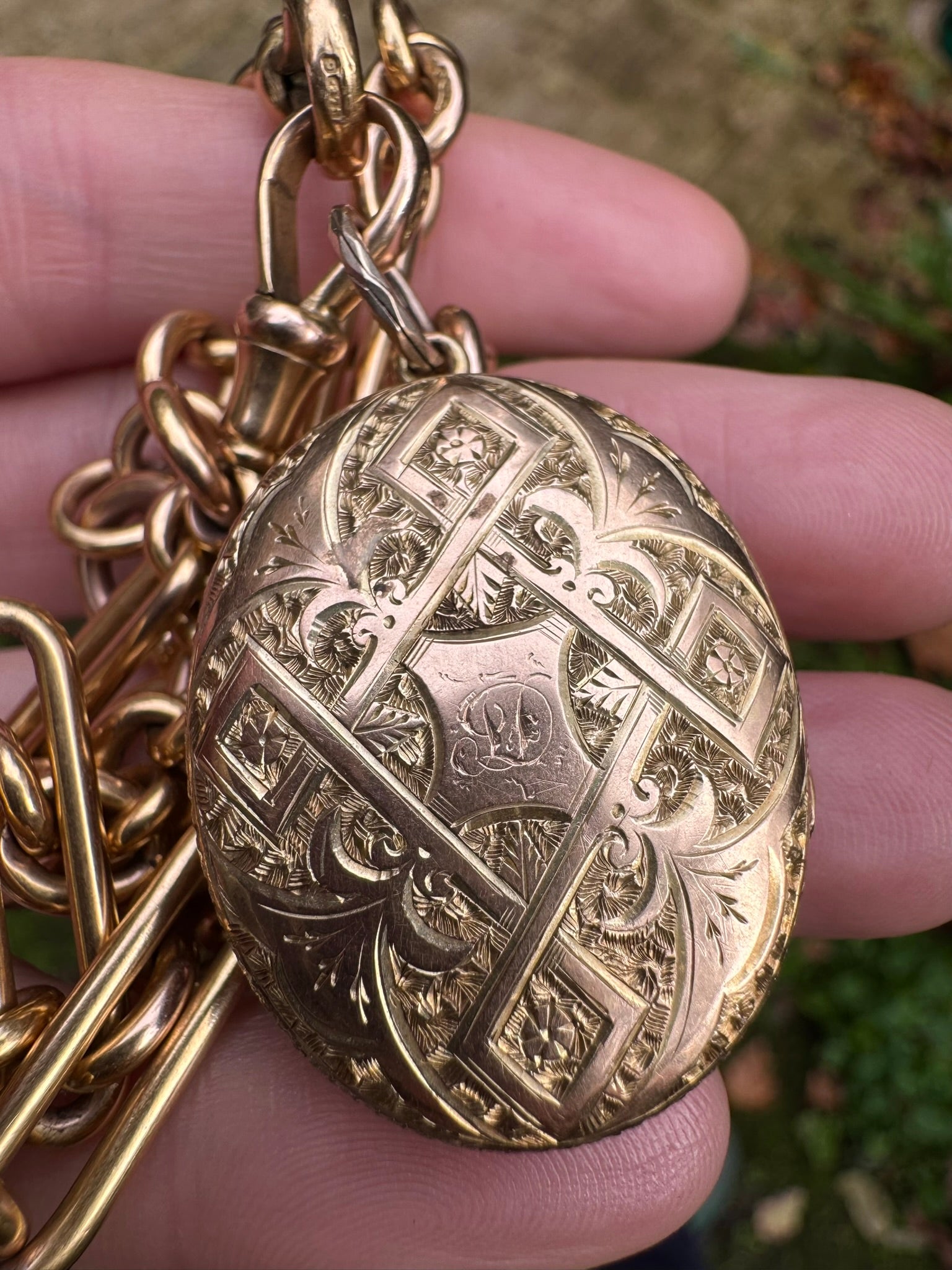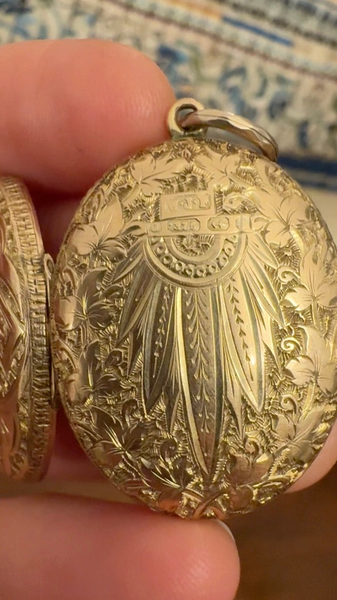 The reverse of the locket is also intricately engraved and features faint initials.