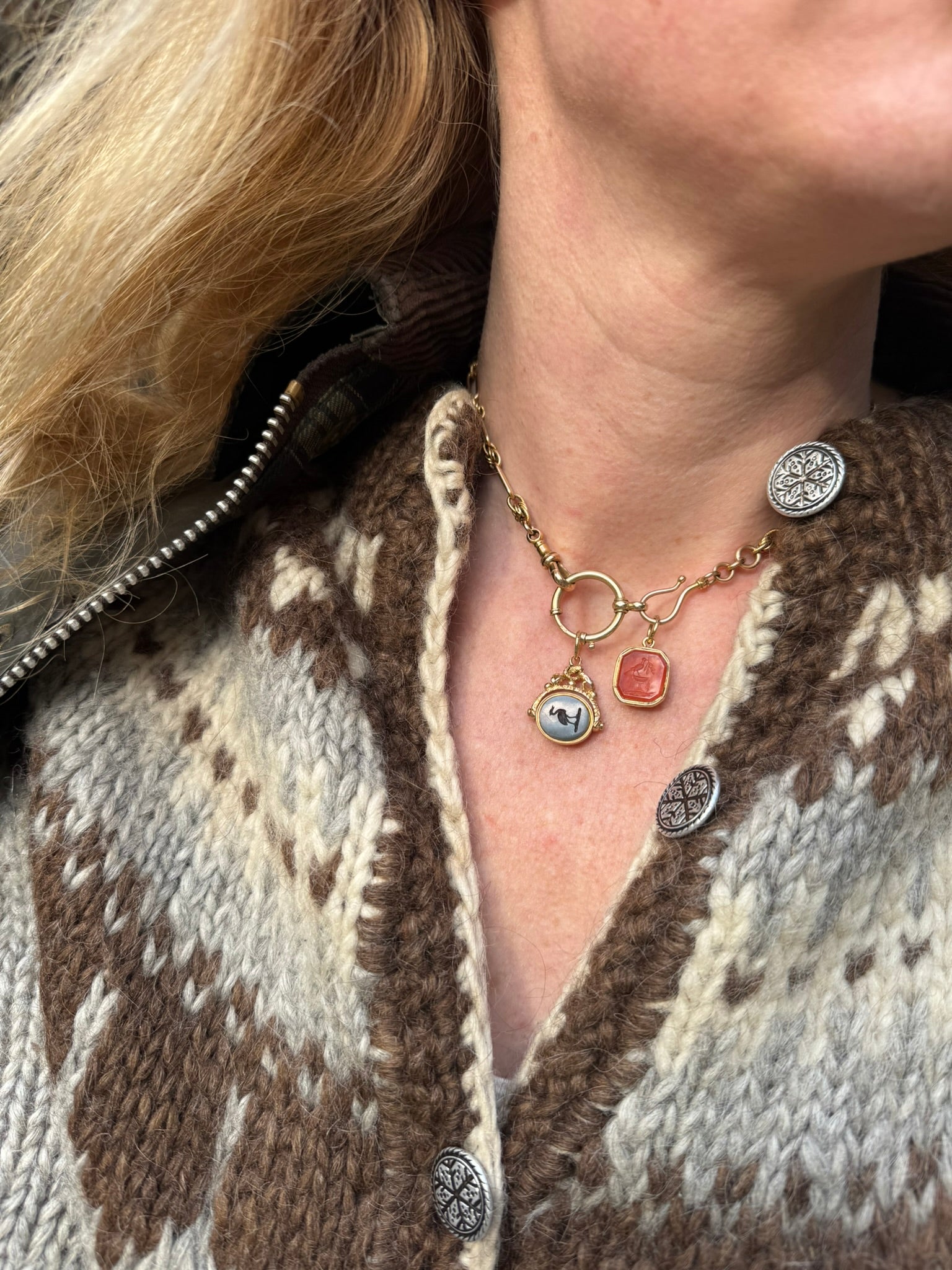 Materials: Top of the fob is 18ct. The frame around the bloodstone and carnelian is 15ct.