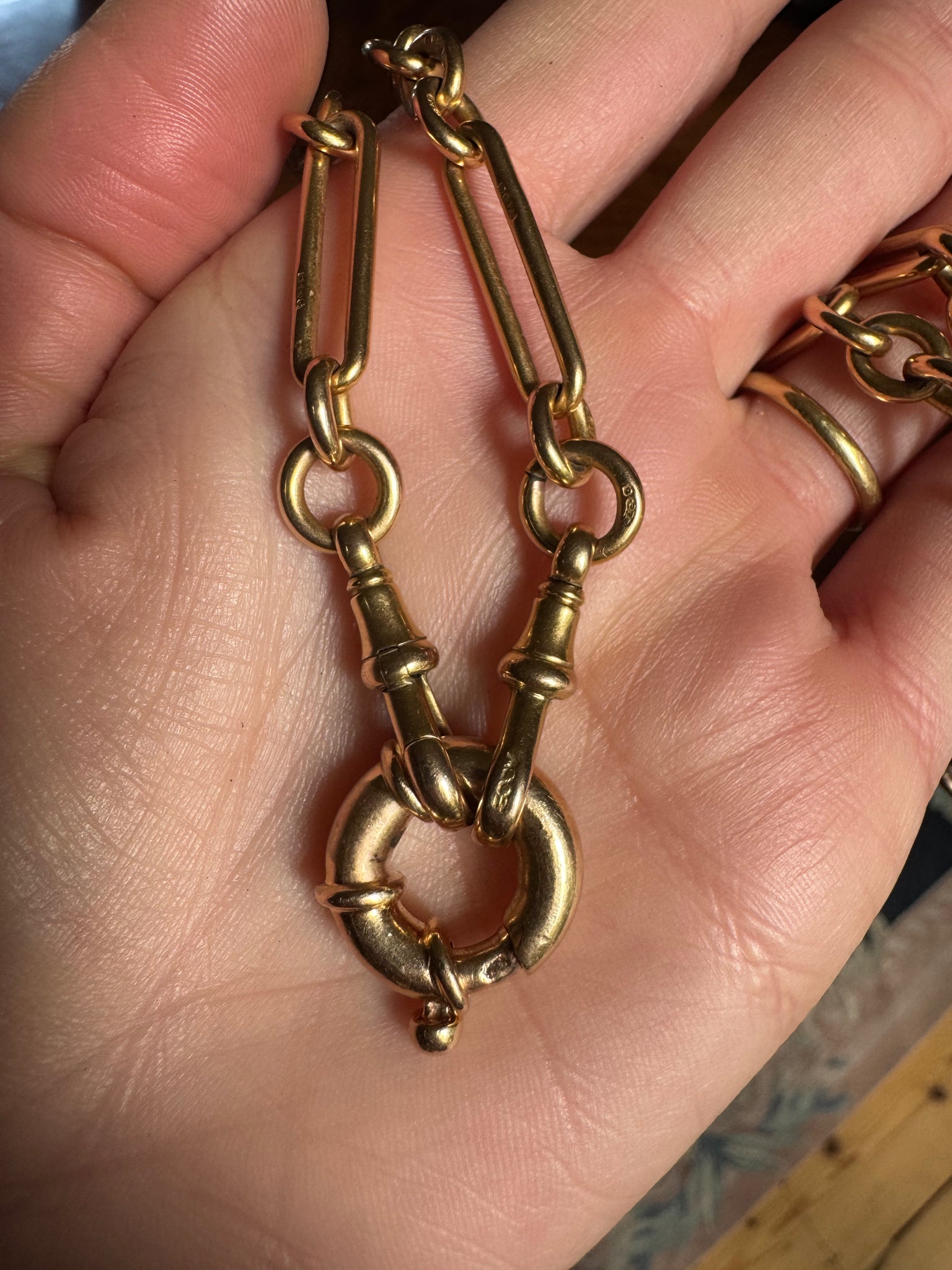 An ultra chunky and useful antique 9ct bolt clasp. This piece can be used to attach pendants or connect pieces of chain. It is a beautiful warm, not too rosy 9ct gold.