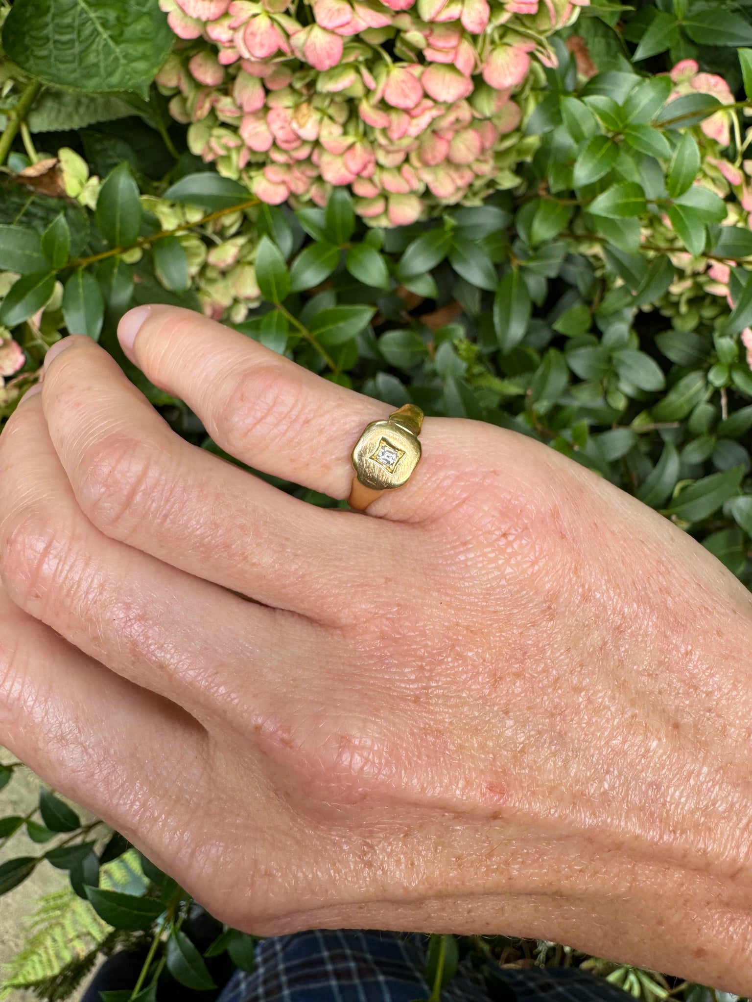 A perfect pinkie ring! I love this little signet. It is wonderfully aged and features a bright, emerald cut stone in the centre. The ring sits low to the finger, but is pleasingly chunky and tactile. The band is in excellent shape, showing no thinning. This is a perfect, elevated everyday piece.