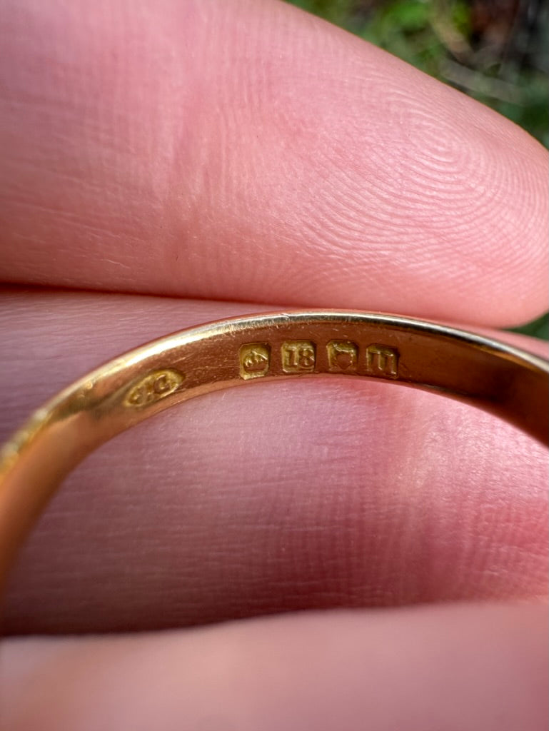 Markings: Fully hallmarked. 18 ct, London, 1915. Makers mark JG.