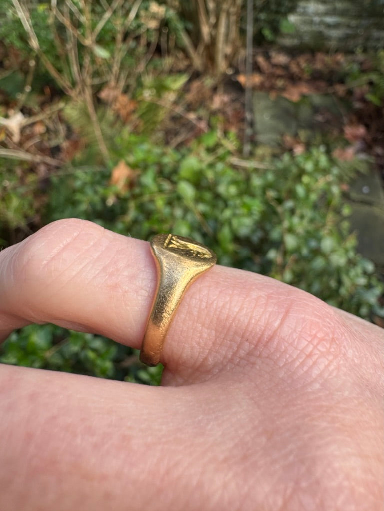 This signet dates to 1915, and is has a fantastic patina. The band is in excellent condition, making this perfect for everyday wear. It sits low to the finger and is ultra soft and comfortable. Just about a perfect old signet!