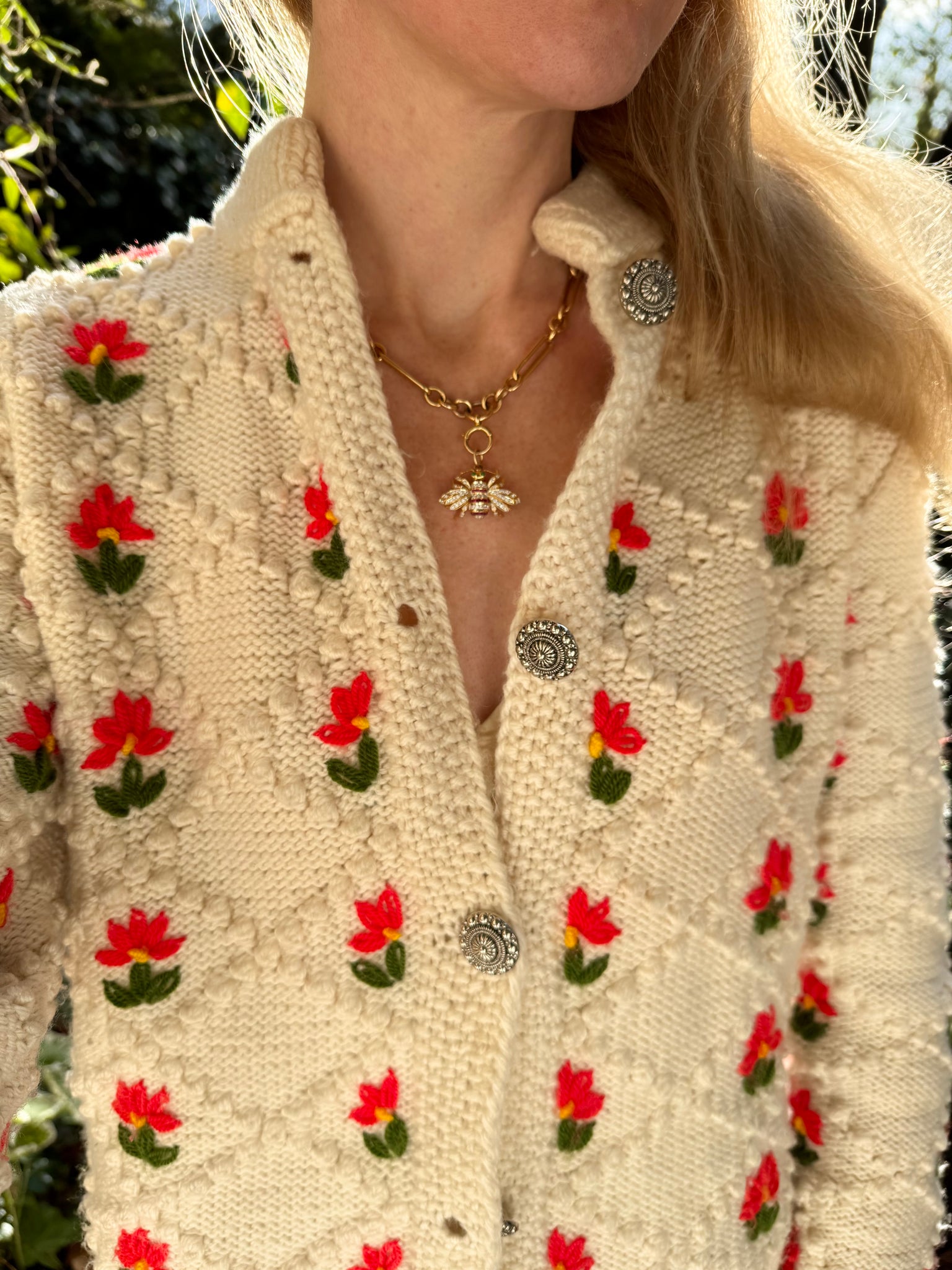 I found this bee brooch and couldn’t resist turning it into a pendant using its original 18ct pin. The bale works over a chain or clipped into a dog clip and the bee is chunky enough to stand out in the messiest of neck stacks. I love the tiny details - the banded body and the textural element of the cabochon rubies and the little split toes. It is just a supremely bright and cheery piece.