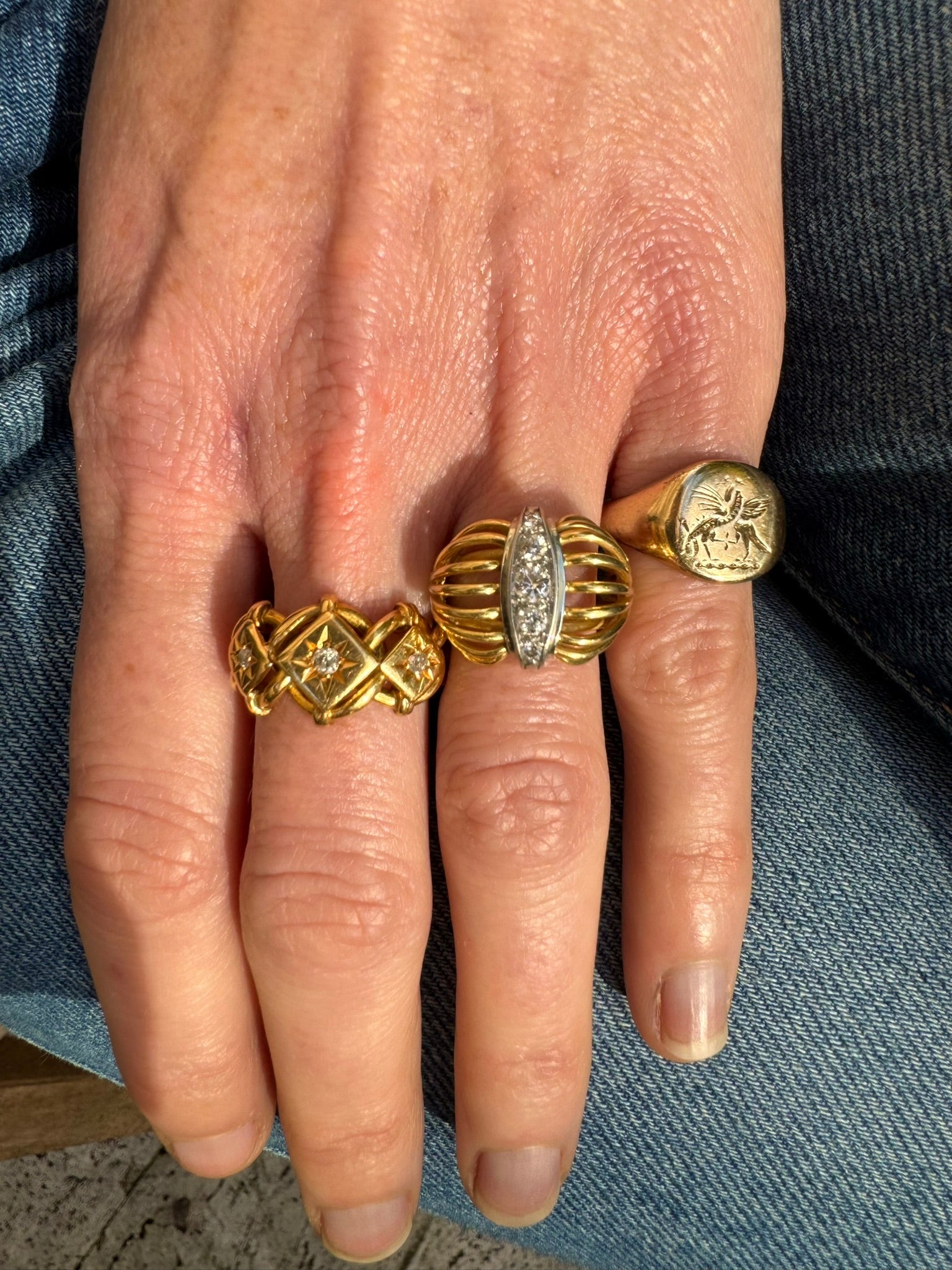I always love a patinated signet ring, and this one is just so fun. The face of the ring features a dragon intertwines with an eagle, who are either embracing or fighting - interpretation is entirely up to the wearer! The ring has been beautifully patinated over the years, but the band is in excellent shape. This is one to wear everyday, forever. The ring is chunky enough to be worn on any finger, but makes for a great pinkie ring.